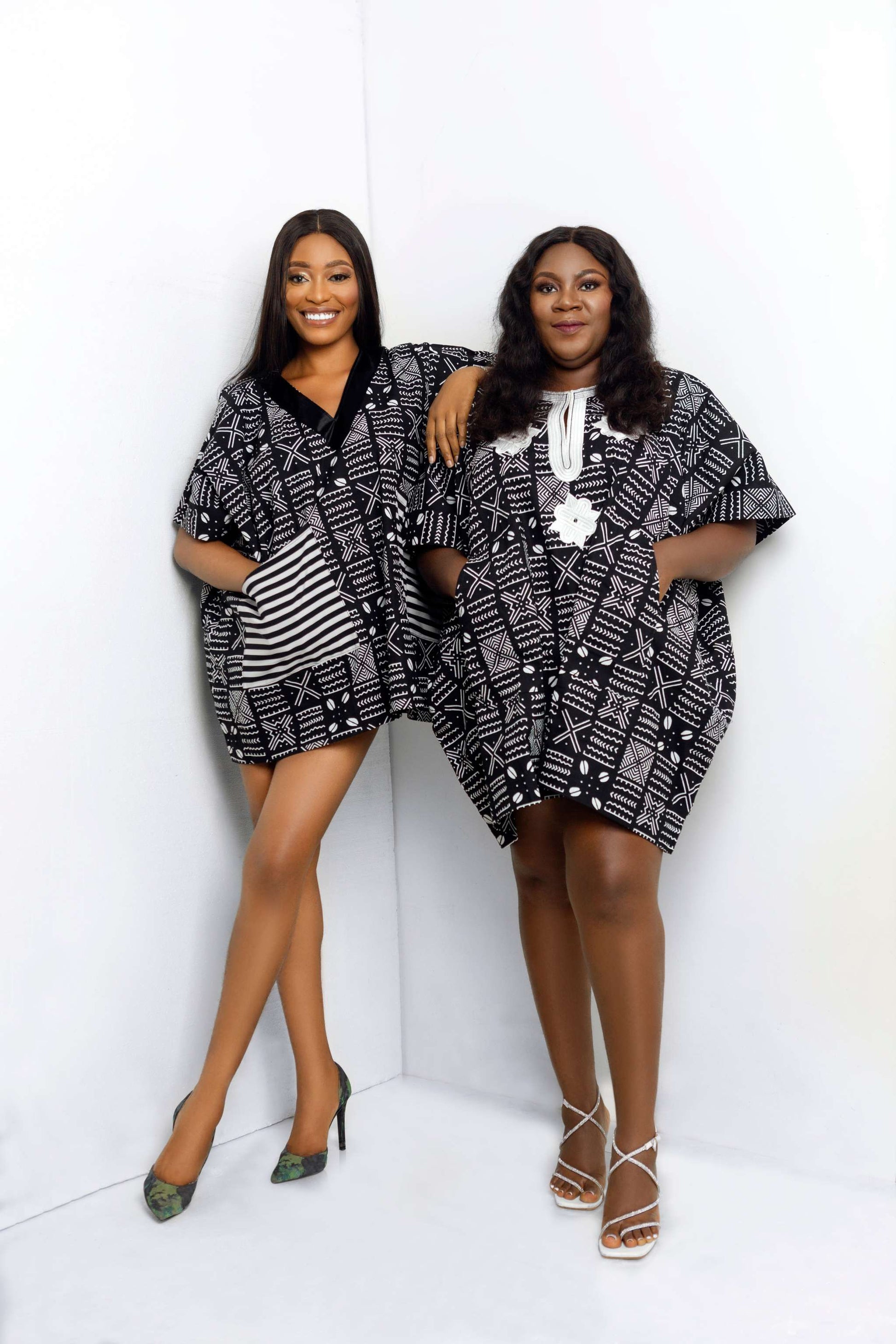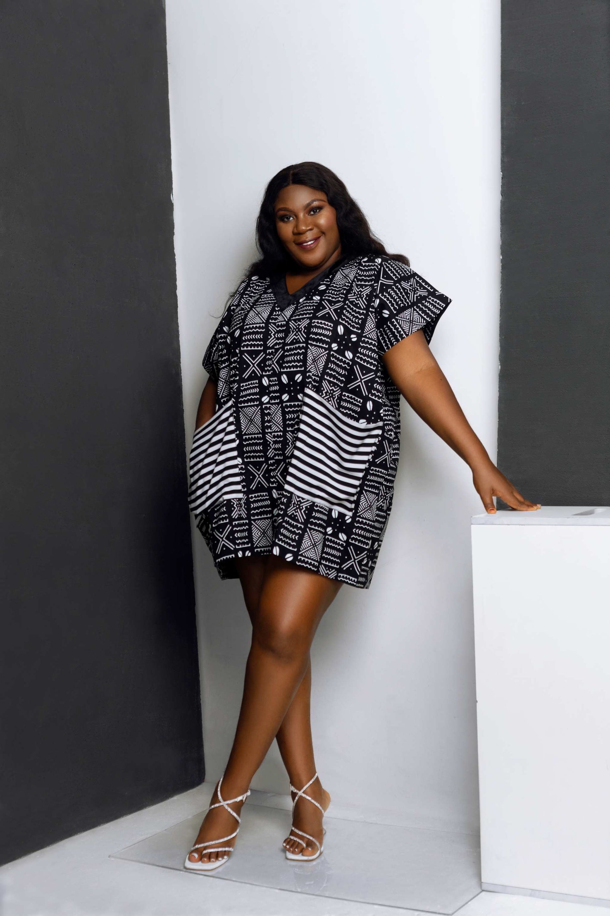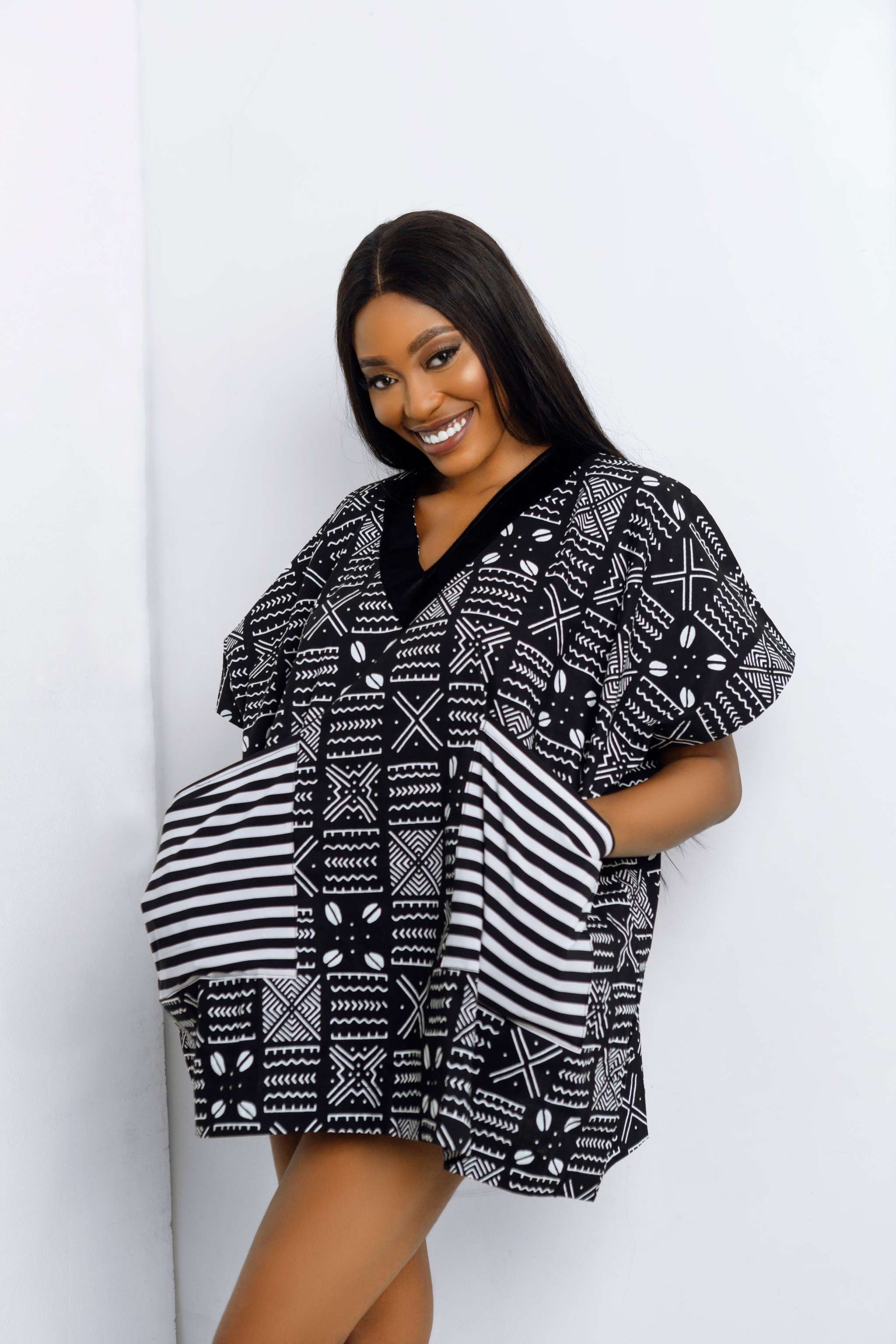 African print danshiki top in black and white print.