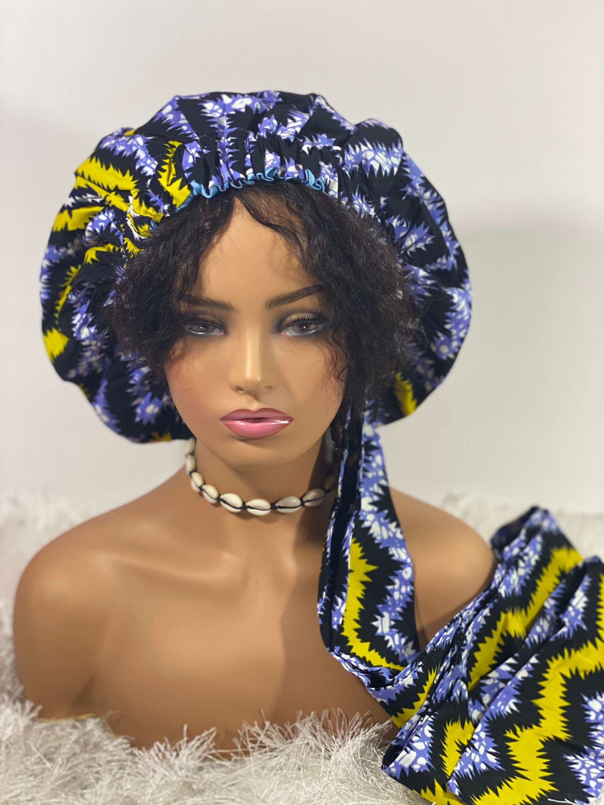 Ankara Satin Lined Head Wrap Hair Bonnets have been handcrafted with the finest quality of Ankara fabric and Satin to protect your natural hair or extensions. This product combines the benefits of the bonnet and the style of a head wrap in one product. It is lined with premium satin so it protects your natural hair all day long and helps your hair retain moisture. It's comfy elastic makes it comfortable for all-day wear. The long straps make it great for creating versatile styles and It’s a great beginner-friendly head wrap for those new to wearing them.