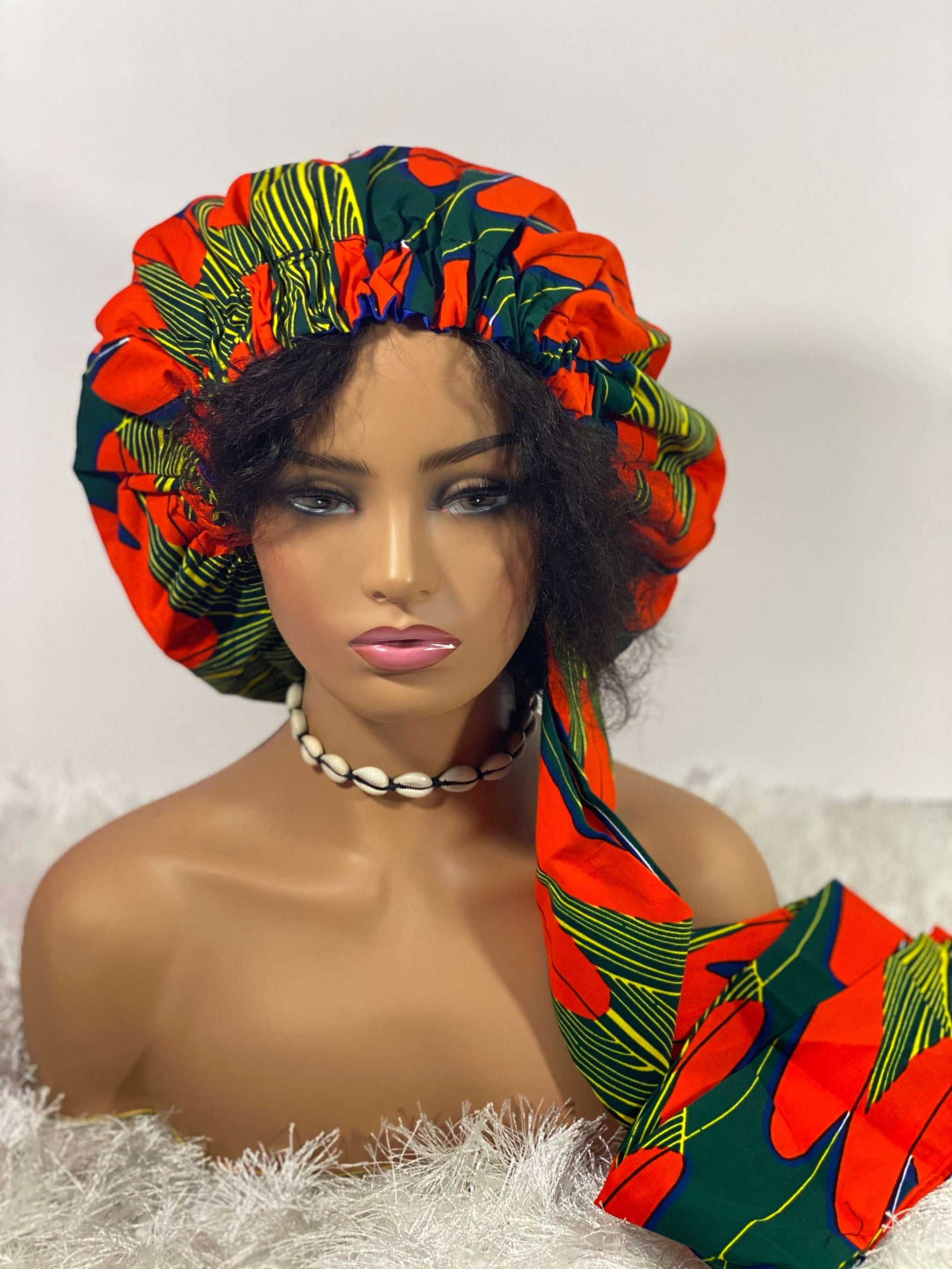 Ankara Satin Lined Head Wrap Hair Bonnets have been handcrafted with the finest quality of Ankara fabric and Satin to protect your natural hair or extensions. This product combines the benefits of the bonnet and the style of a head wrap in one product. It is lined with premium satin so it protects your natural hair all day long and helps your hair retain moisture. It's comfy elastic makes it comfortable for all-day wear. The long straps make it great for creating versatile styles and It’s a great beginner-friendly head wrap for those new to wearing them.