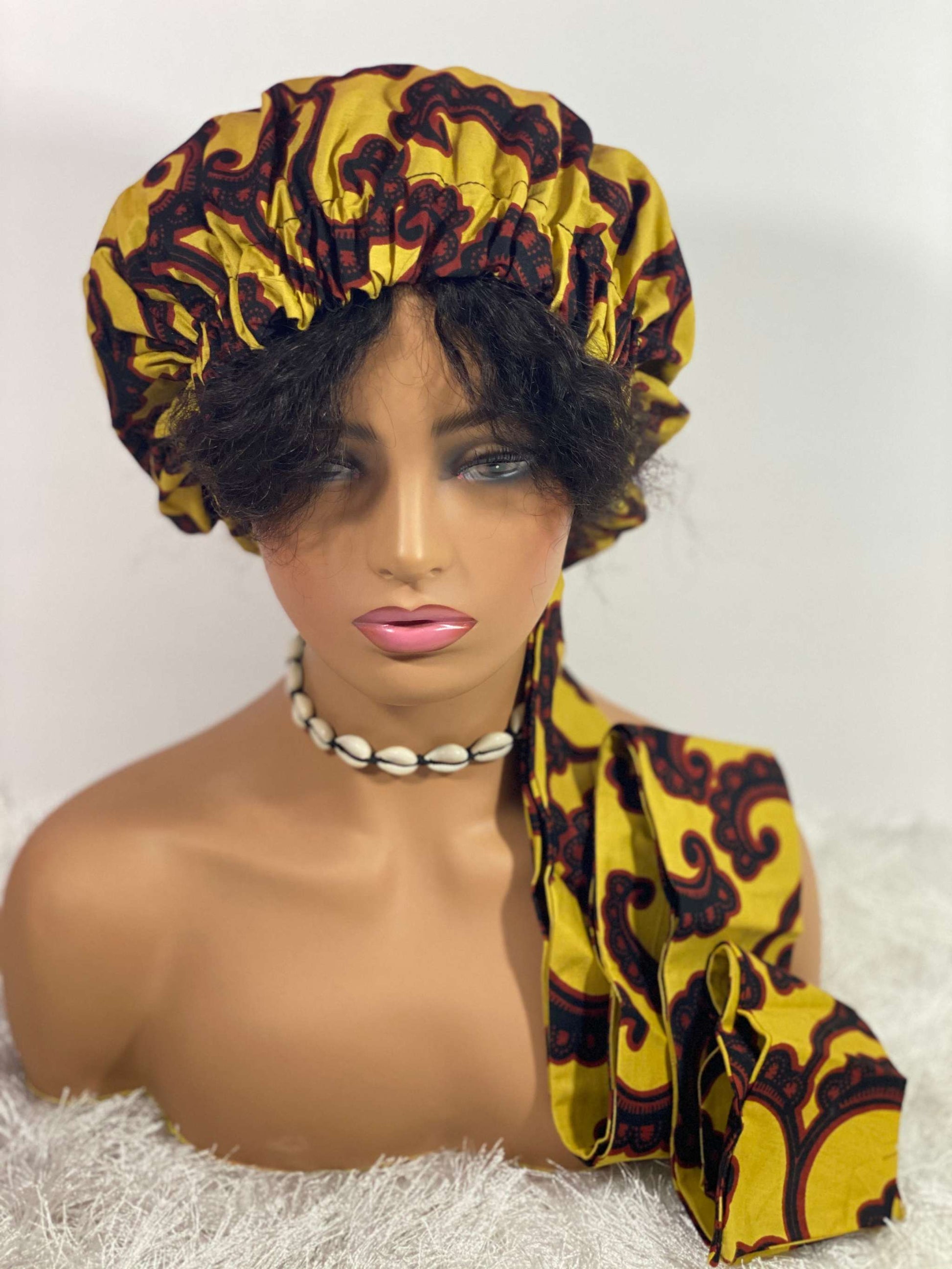 Ankara Satin Lined Head Wrap Hair Bonnets have been handcrafted with the finest quality of Ankara fabric and Satin to protect your natural hair or extensions. This product combines the benefits of the bonnet and the style of a head wrap in one product. It is lined with premium satin so it protects your natural hair all day long and helps your hair retain moisture. It's comfy elastic makes it comfortable for all-day wear. The long straps make it great for creating versatile styles and It’s a great beginner-friendly head wrap for those new to wearing them.