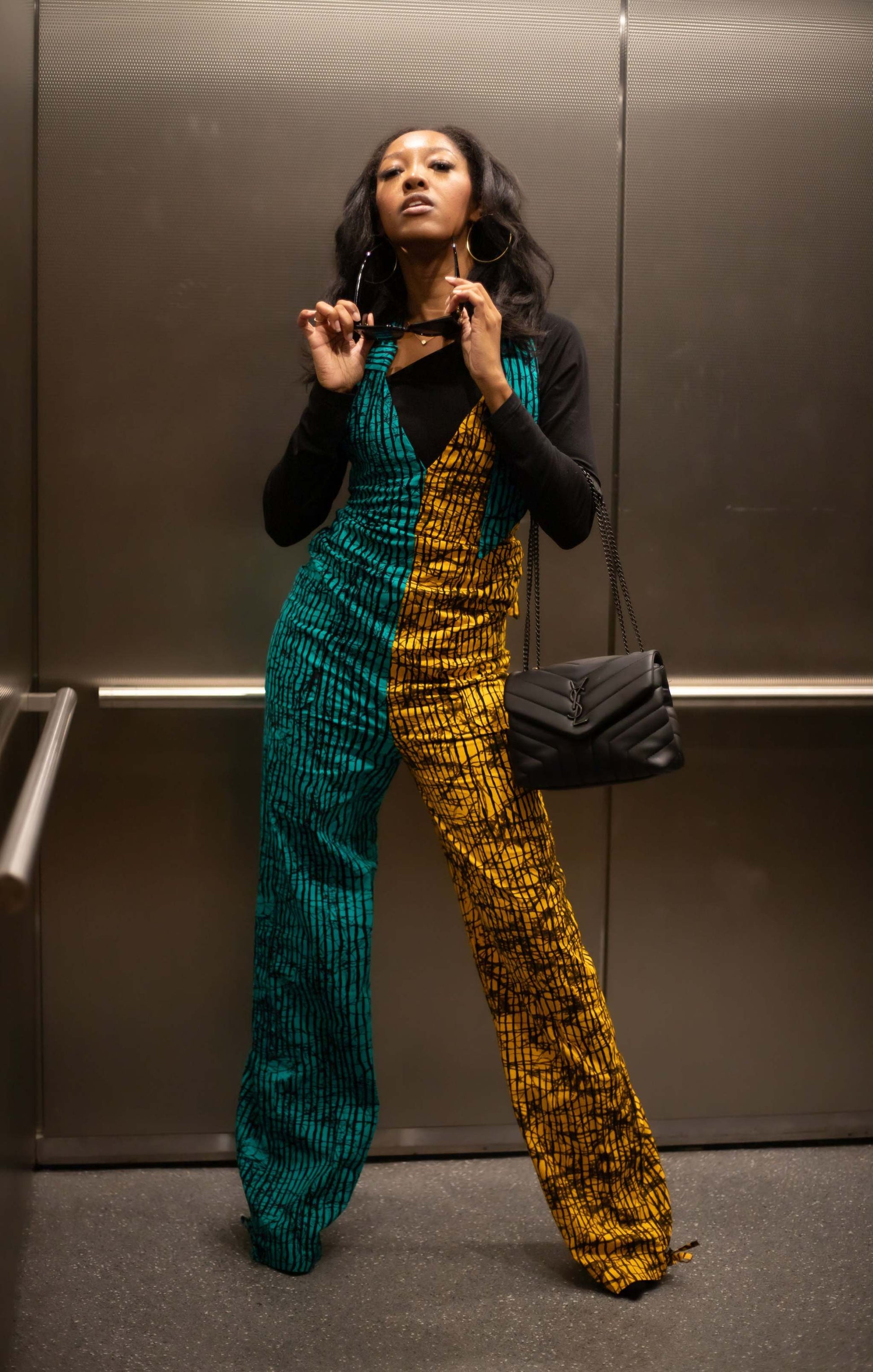 Show up stylishly in Mimi African print wide leg jumpsuit made with a mix of yellow and Teal green pattern for your next event and expect more compliments.